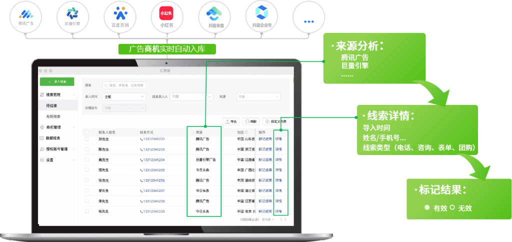 以开篇的抛砖引玉多平台接入为例,我们的站外推广主要是一些新媒体平台:百度、巨量、美团、快手、头条系都有推广,这时候多平台的线索转入统一管理就很有必要了: