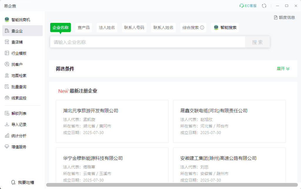 2、 探迹:他们的亮点在于后台集成了 企业信息在后台,更多的是卖数据的作为亮点,EC-CRM也集成了这样的功能,其实现在已经不是亮点了。