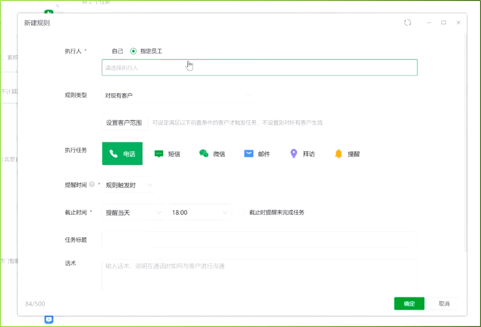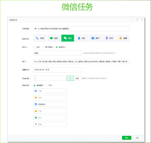 安排某人在某个时间段用微信与客户大体沟通什么内容,并设置任务提醒对方,这个功能很赞,电话任务也可以去设置原理是一个样的,任务系统+销售模版可以自己建,不断的提炼最佳销售流程,根据以往的数据固化为日常流程,通过主管分配任务,优秀自律的销售可以自己创建任务去执行。