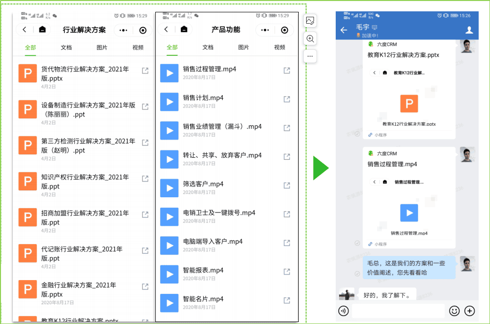 在我们需要与客户微信沟通的时候,微信的素材库是在后台集成共享的,这些后台的数据可以方便的让销售分享给客户,大大的提高了跟进的效率。