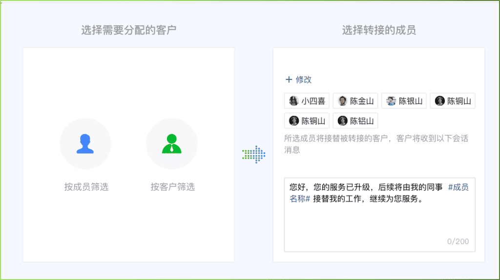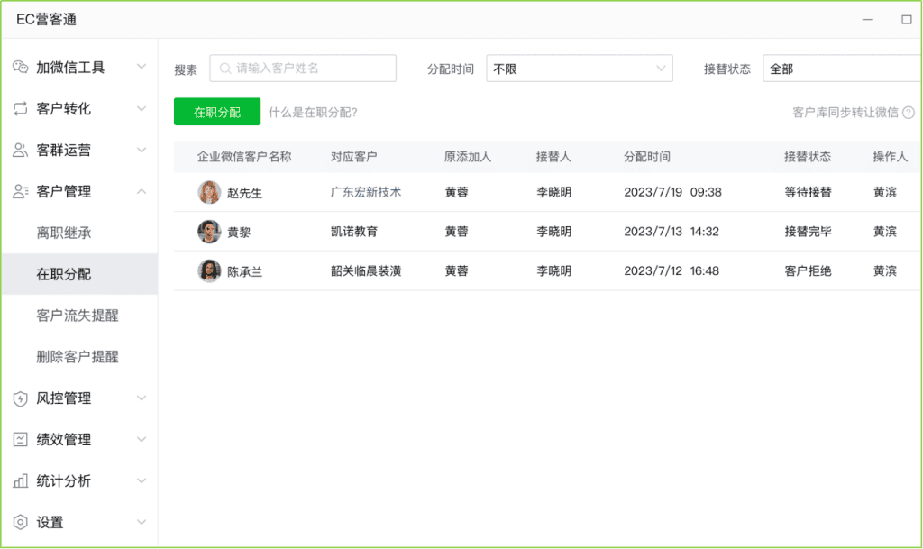 这个功能很多软件会有,但是EC-CRM的特点在于他继承给新销售的是动态、全部的数据,比如他以前的聊天记录、拨打电话的语音记录、标签等全部可以转移给下一个销售进行查看。