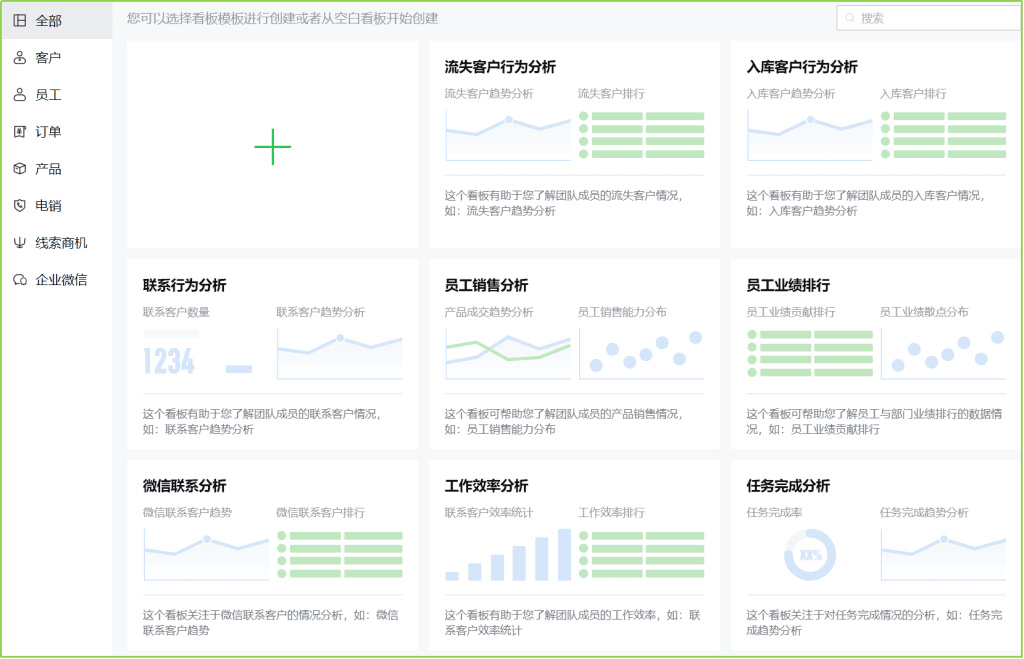 前面我提到EC是客户端版本所以标签比较多比较自由,它的报表也是可以多维度的自定义的,智能报表可自定义BI数据模块,一个界面汇总所需的数据报表,灵活根据公司业务流定制数据报表界面 数百种报表组合,让公司团队管理层能够清晰地了解销售效率、业绩增长、员工排名、客户运营、客户流失等情况,对,你没有看错是几百种的报表组合。