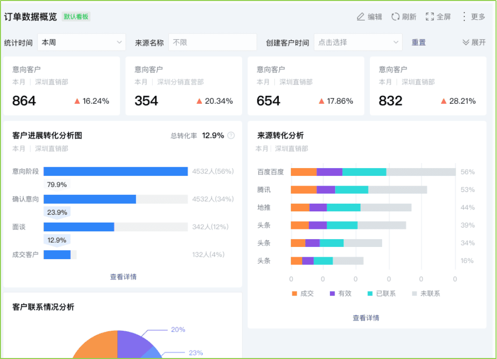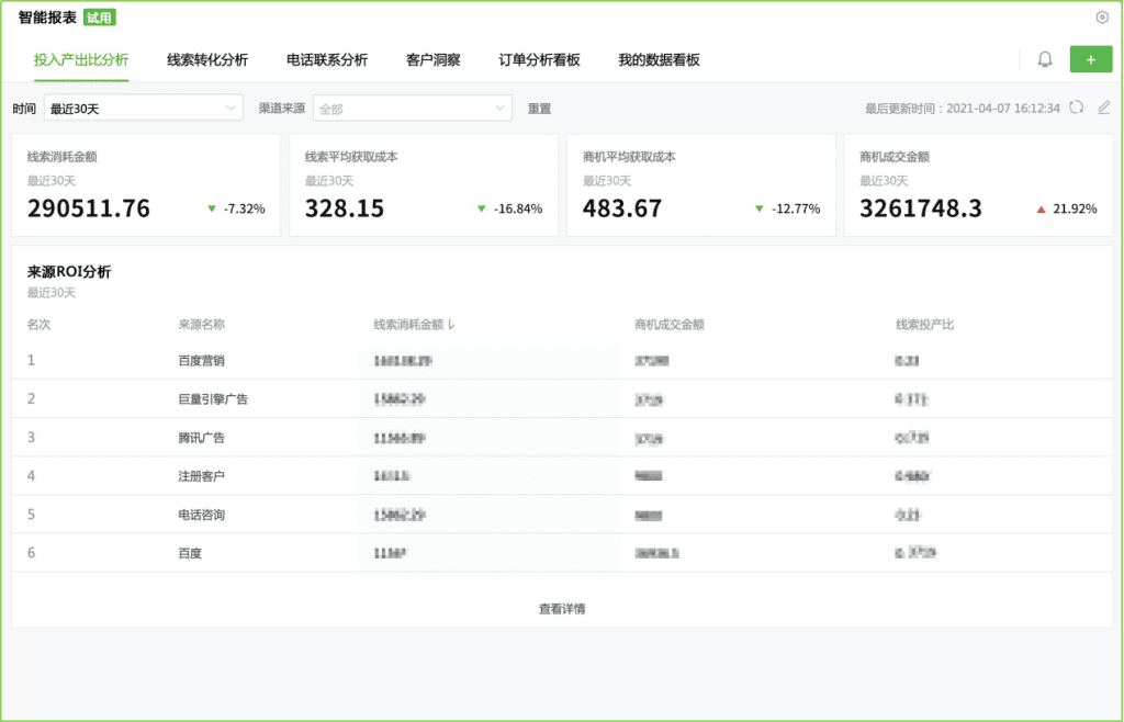 商机可以实时自动的导入进来,这样也会对多平台的广告效果进行实质性的监测,以前都是人工表格统计,现在可以一目了然方便管理。