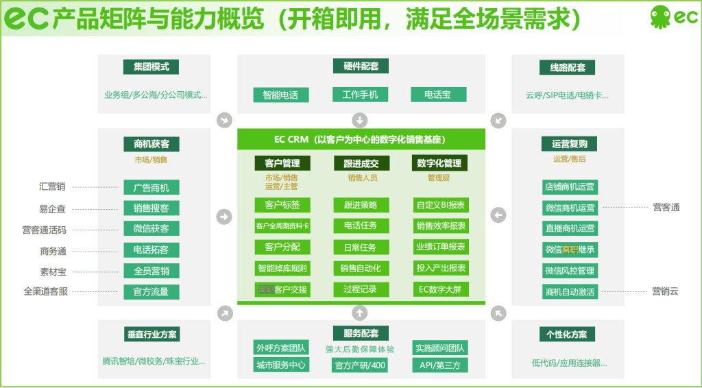 在这块是我选择EC-CRM的主要原因吧,大家都知道现在都喜欢用微信沟通,很多的企业都在使用企业微信联系客户,EC-CRM与企微是互通的,包括公司组织架构、账号体系、客户资料、客户动 轨迹实时同步,从拓客到运营服务全流程在线。