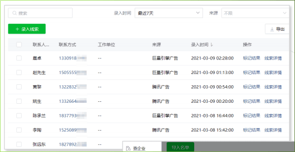 另外:就比如前端某平台进入的线索,我可以通过后台的大数据进行对比,这样就容易判断客户的身份和意向度,就是把全网的数据打通在一起了,你可以搜客户找客户判断客户的身份,导入的数据可以给到自己也可以分配给同事。
