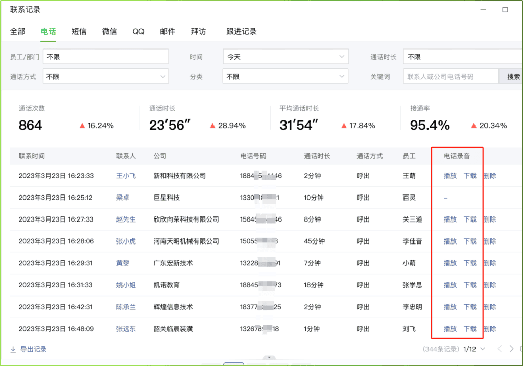 我们的客户在接进来之后需要电话和微信沟通,那么每次呼叫的电话录音是有的,但是也是需要汇总在系统里面,并且我还要销售与客户的微信聊天记录,每一个主管可以方便去查看业务员的销售话术是否符合规范。