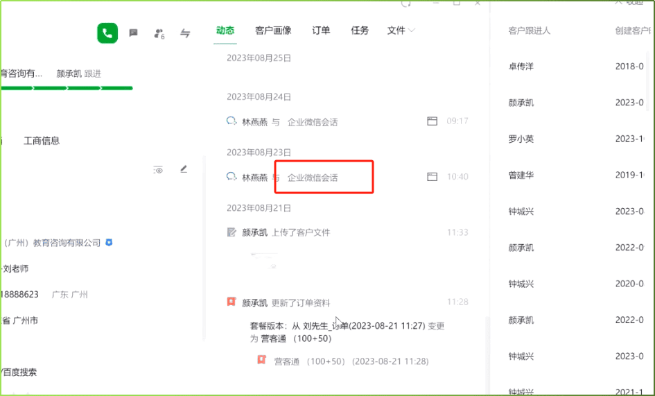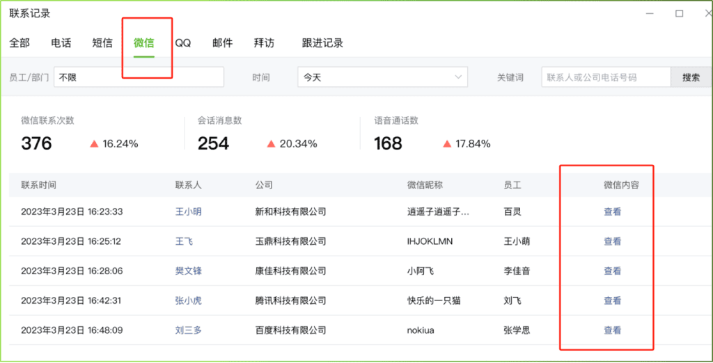 也就是我不但可以了解销售的语音电话录音还能通过微信的聊天记录进行追踪,这块在做私域的时候比较有用,也能够根据客户的跟进状态进行复购的激活,最主要的是这种微信、电话的沟通记录也可以在离职交接的时候,继承给下一个员工,做比较详细的承接,这个问题后面会提到。