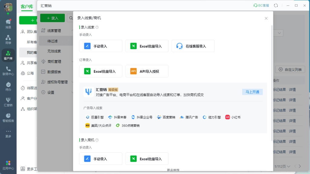 1. 多平台线索整合:将百度、巨量、快手、美团等推广平台的线索自动导入统一系统,避免 “线索散落在 Excel、微信、平台后台” 的混乱;