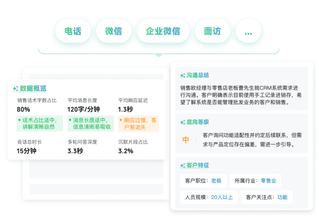 支持电话、微信、企业微信、面访录音、手动上传录音等场景质检,确保每一次沟通都有迹可循、有标可依