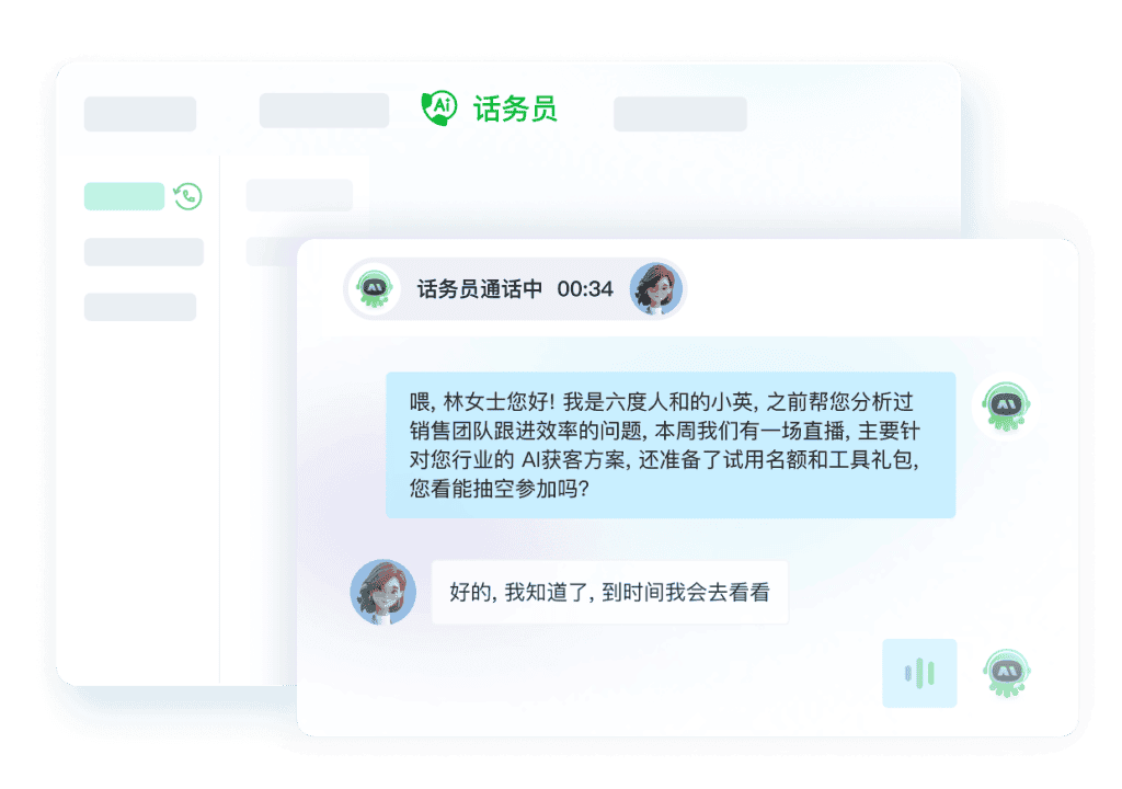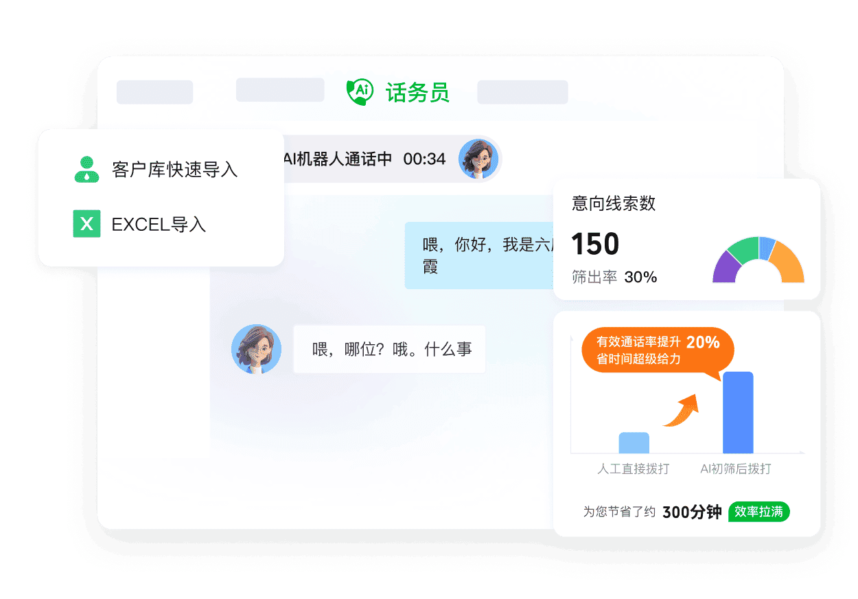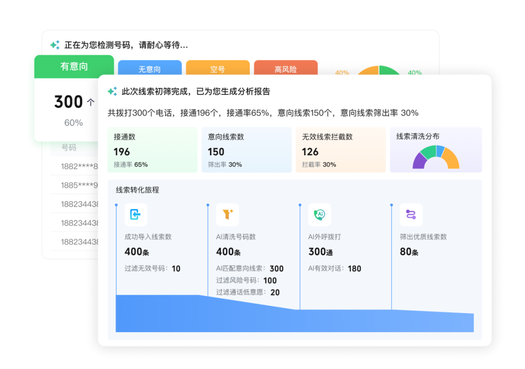 从号码有效性检测到对话深度分析,层层递进,确保高意向客户不漏筛;在对话中捕捉关键词、语调和情绪变化,快速识别客户意向